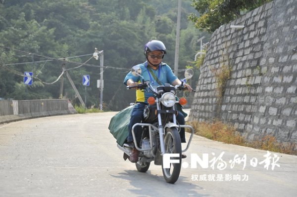 藍盛金騎行在送錄取通知書的山路上。福州日報記者 鄭帥攝