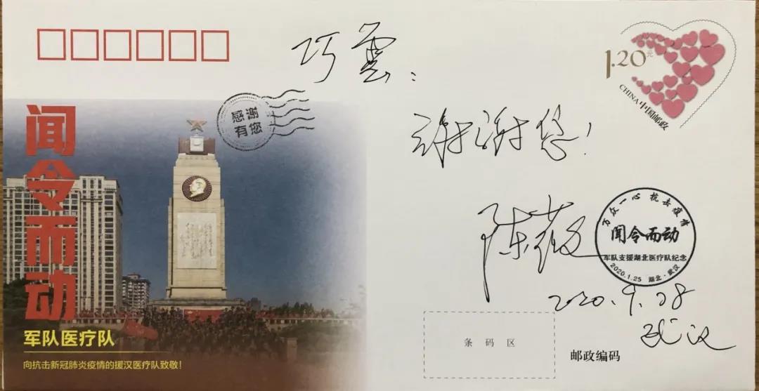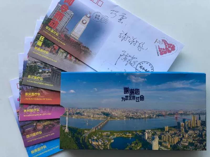 疫情期間,武漢市分公司為表達武漢人民對不計報酬、不論生死的援漢醫療隊感恩、感謝、感激之情,以31支援漢醫療隊為主題,融合武漢人文風光和特色地標元素,與人民日報社新媒體中心聯合開發了這套《感恩有你》抗疫紀念郵資封。用郵政特有的“文化符號”致敬仁心、感恩大愛,銘記為武漢拼過命的人們。9月24日,在挑選送給108位勇士的禮物時,從軍29載的陳薇院士經過反復斟酌和比較,在武漢市分公司推薦的多款抗疫郵品中,最后敲定了這套含有軍隊醫療隊紀念封的郵品。