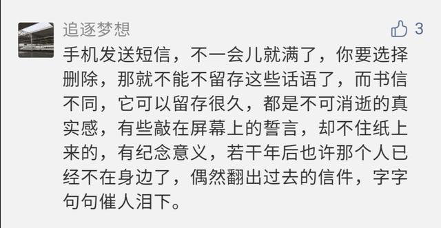 網(wǎng)友追逐夢(mèng)想說(shuō):“手機(jī)發(fā)送短信,不一會(huì)兒就滿了,你要選擇刪除,那就不能留存這些話語(yǔ)了。而書(shū)信不同,它可以留存很久,都是不可消逝的真實(shí)感。有些敲在屏幕上的誓言,卻不如紙上來(lái)的,有紀(jì)念意義。若干年后也許那個(gè)人已經(jīng)不在身邊了,偶然翻出過(guò)去的信件,字字句句催人淚下。”