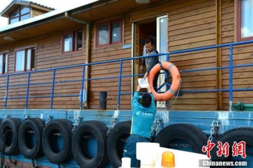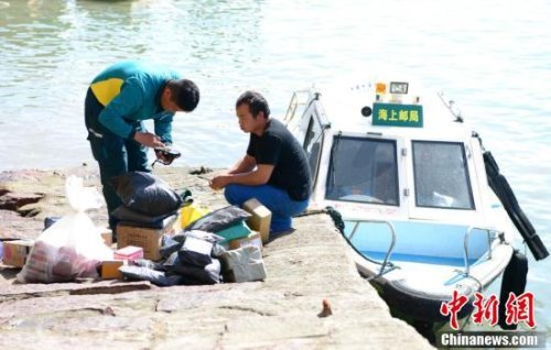 “雙十一”剛過,福建省寧德市蕉城區海上郵遞員石進全比往常更加忙碌。圖為村民到碼頭領取包裹。