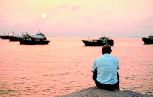 下班后,謝堅在廣東珠海市外伶仃島海邊望著遠方(2020年4月21日攝)。 本報記者鄧華攝