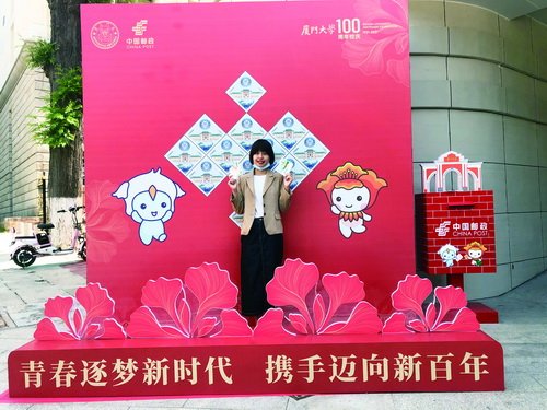 為獻(xiàn)禮廈大百年華誕,中國郵政集團(tuán)特別為廈門大學(xué)校園主題郵局開通了廈門大學(xué)百年校慶專題個(gè)人定制郵票服務(wù),校友和師生掃描中國郵政“微郵筒”二維碼進(jìn)入郵票DIY界面,就可讓自己的照片登上郵票,將個(gè)人與廈門大學(xué)百年華誕珍貴瞬間一起定格,永遠(yuǎn)珍藏。該服務(wù)支持線上、線下定制,在主題郵局網(wǎng)點(diǎn)內(nèi)可立等可取。目前有“我在廈大等你”和“鳳凰花開 青春綻放”兩種版式可選。