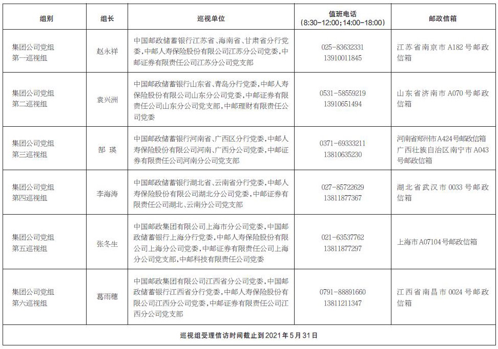 中國郵政集團(tuán)有限公司黨組2021年第一批巡視進(jìn)駐一覽表