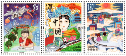 《兒童畫作品選》特種郵票一套3枚,分別為《我的中國夢》《國粹之韻》《希望與夢想》?!段业闹袊鴫簟吠ㄟ^描繪我國航空航天事業、城市、交通網絡繁榮發展等場景,表達了少年兒童不斷追尋對宇宙探索的夢想以及對未來美好生活的想象與憧憬;《國粹之韻》描繪了傳統文化與城市發展、現代科技共繁榮的場景,表達了新時代的少年兒童對中華優秀傳統文化的追求和傳承;《希望與夢想》描繪了偉大祖國不斷發展的場景,少年兒童登高望遠、憧憬未來。三枚郵票緊密圍繞主題,展現出少年兒童對黨的領導下偉大祖國的美好祝愿、熱愛和自豪。其中,《國粹之韻》由合肥新站壽春實驗中學的費玉婷同學設計。