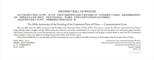 2021年6月29日,《中國共產(chǎn)黨成立100周年》紀(jì)念郵票和紀(jì)念封在中國共產(chǎn)黨歷史展覽館隆重發(fā)布。中共中央宣傳部副部長蔣建國,國家郵政局黨組書記、局長馬軍勝,中國郵政集團有限公司黨組書記、董事長劉愛力出席發(fā)布儀式并為《中國共產(chǎn)黨成立100周年》紀(jì)念郵票揭幕,國家郵政局黨組成員、副局長戴應(yīng)軍,中國共產(chǎn)黨歷史展覽館館長吳向東,中國郵政集團有限公司黨組成員、副總經(jīng)理康寧為《慶祝中國共產(chǎn)黨成立100周年》紀(jì)念封揭幕。中國郵政集團有限公司黨組成員、副總經(jīng)理王儉主持。