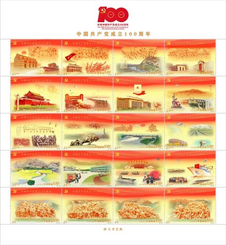 按照中國共產(chǎn)黨成立100周年慶祝活動安排,經(jīng)報請黨中央批準(zhǔn),中國郵政將于2021年7月1日發(fā)行《中國共產(chǎn)黨成立100周年》紀(jì)念郵票1套20枚,紀(jì)念封1套1枚。此次活動發(fā)布了紀(jì)念郵票的詳細信息,內(nèi)容分別為:1.開天辟地;2.崢嶸歲月;3.中流砥柱;4.偉大勝利;5.開國大典;6.抗美援朝;7.制度奠基;8.自力更生;9.改革春潮;10.對外開放;11.世紀(jì)騰飛;12.科學(xué)發(fā)展;13.擺脫貧困;14.全面小康;15.強軍興軍;16.揚帆遠航;17.信仰;18.偉業(yè);19.攻堅;20.追夢。郵票采用連票設(shè)計形式,以紅色、金色為畫面主基調(diào),運用油畫寫實手法表現(xiàn),并采用連綿不斷的飄帶貫穿整體,寓意中國共產(chǎn)黨百年奮斗的光輝歷程。該套郵票特別使用兩色紅熒光油墨,在紫光燈下,慶祝建黨百年標(biāo)識、“一大會址”、“天安門”等郵票主體元素閃放璀璨的光芒。