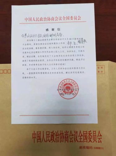 3月10日,中國人民政治協商會議全國委員會辦公廳向石景山區分公司寄來感謝信,對郵政兩會服務工作給予充分肯定和衷心感謝。信中表示,石景山區分公司郝飛、張宇燕同志在大會期間加班加點,恪盡職守、熱情服務,出色地完成大會秘書處交辦的各項工作任務。