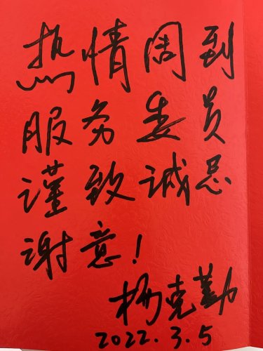 全國政協委員楊克勤寫下:熱情周到服務委員,謹致誠懇謝意!