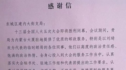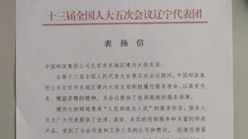 遼寧代表團在感謝信中提到,“建內大街支局秉承‘人民郵政為人民’的服務宗旨,為廣大代表提供了優質、高效、務實的用郵服務和豐富的郵政產品,受到了與會代表和工作人員的認可和贊許,投遞員清晨就將當天的會議用報及郵件送到駐地,保證了時限。在此向中國郵政致以誠摯的感謝,并提出表揚!”