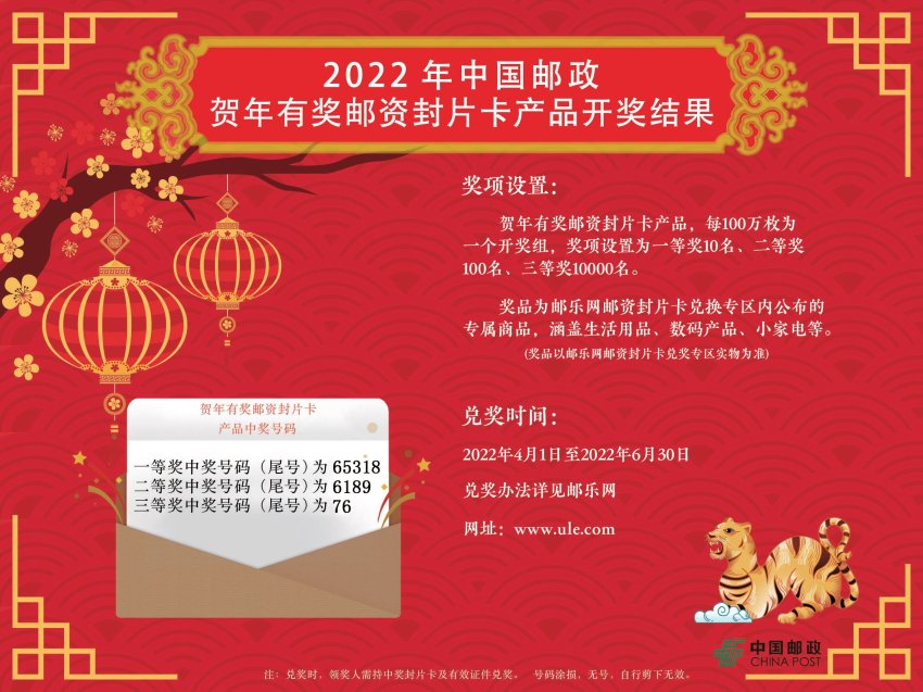 2022年賀年有獎郵資封片卡中獎號碼于3月18日產生?,F將中獎信息通知如下: