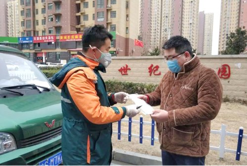 2月5日是亳州市首個開放限購口罩的日子,當天市分公司收到訂單后,第一時間配送口罩。下午15時,家住世紀花園的張奎從郵政快遞員丁偉杰手上接過口罩,成為亳州市第一位收到政府限購口罩的市民。