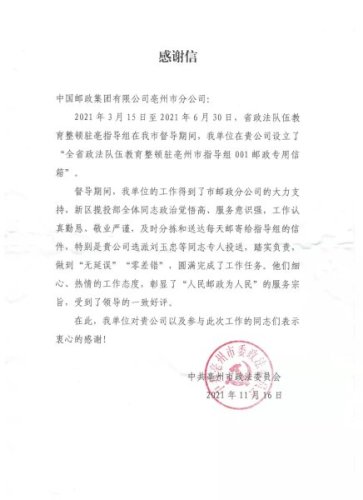 2021年3月15日至6月30日,省政法隊(duì)伍教育整頓駐亳指導(dǎo)組在亳州督導(dǎo)期間,在亳州郵政申請(qǐng)開通了專用信箱用于接收相關(guān)郵件。亳州市分公司新區(qū)攬投部政治覺悟高,服務(wù)意識(shí)強(qiáng),工作認(rèn)真勤懇,嚴(yán)謹(jǐn)敬業(yè),每天及時(shí)分揀和投遞信件,做到“無(wú)延誤”“零差錯(cuò)”,圓滿完成了工作任務(wù)。