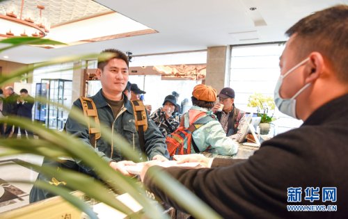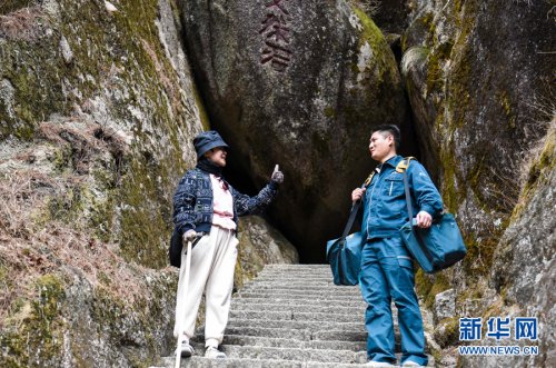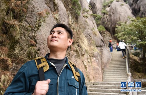 3月16日,黃山風景區內,謝菲俊背著郵包仰望山頂。