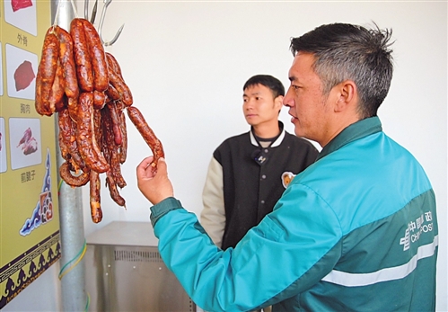 在直播間,牦牛肉腸很受歡迎,直播前哈弄奪機(jī)都要仔細(xì)查看貨源品質(zhì)。□張晉通 攝