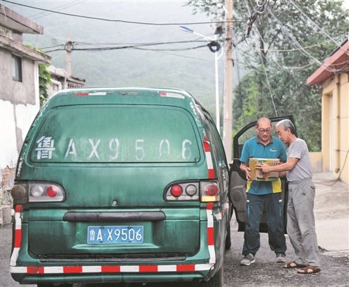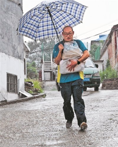 帶著這些郵件,許桂明駕駛郵車冒著大雨在蜿蜒的山路上行進。“上午還是烈日當頭,汗流浹背,下午就是瓢潑大雨,全身淋透,這在山區很正常。”許桂明說。停好車,撐起傘,許桂明把郵件緊緊抱在懷里,沿著小路跑進村里。10年來,他始終牢記“人民郵政為人民”的服務宗旨,走遍了這15個行政村的家家戶戶,與村民們相熟相知,遇到不方便外出購物的老人以及需要幫助的村民,他都主動幫助捎送生活物資。