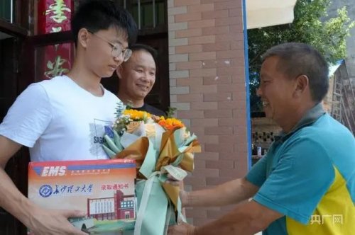 “譚醫生,你兒子的錄取通知書到啦。”郵車還未停下,喜報聲便搶先“進門”,拿起錄取通知書后,吳江南捧出一束郵局準備的鮮花。“沙明村考上個大學生不容易,這也是我們的一份心意。”