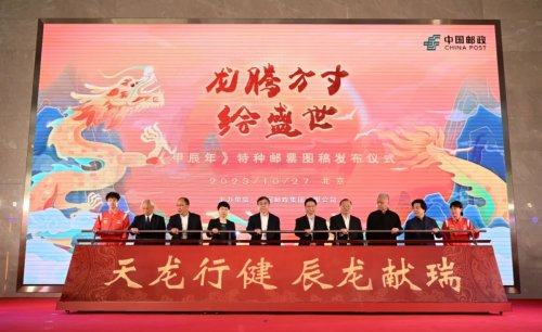 10月27日,中國郵政《甲辰年》特種郵票圖稿發(fā)布儀式在京舉行。國家郵政局副局長、中華全國集郵聯(lián)合會會長戴應(yīng)軍,中央港澳工作辦公室巡視員許麗,中國郵政集團有限公司黨組書記、董事長劉愛力,黨組副書記、總經(jīng)理鄭國雨,黨組成員、副總經(jīng)理康寧,觀復(fù)博物館創(chuàng)辦人、著名文化學者馬未都,中國社科院榮譽學部委員、民俗學會名譽會長劉魁立,中國國家乒乓球隊運動員林高遠、于子洋、陳幸同、錢天一等出席活動。發(fā)布儀式上公布了《甲辰年》特種郵票圖稿并同步啟動郵票印制。
