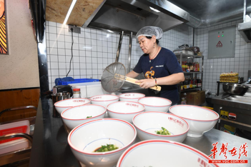 光頭、絡腮胡、大花臂,長沙伢子周瞰戲稱自己是“最不像粉店老板的粉店老板”。大紅色的個性裝飾、循環播放的嘻哈音樂,只有扁粉、沒有外賣的經營理念,也讓他的輝記面粉店成為長沙“最傲嬌”的粉店。