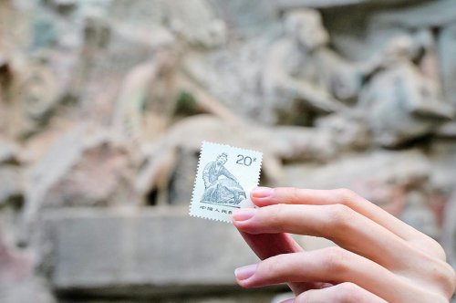 郵票上的大足石刻“養雞女”。