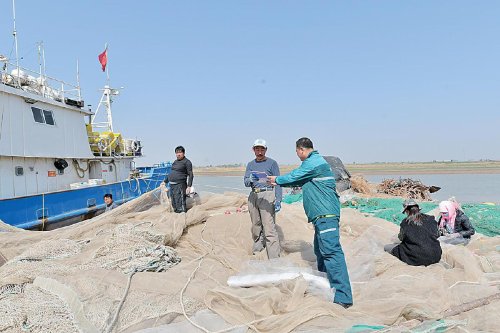 無棣埕口郵政支局投遞員王海進在投遞途中幫客戶倒網收蝦。