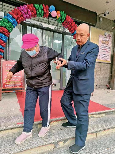 王涌攙扶行動不便的老年客戶走下營業所臺階。