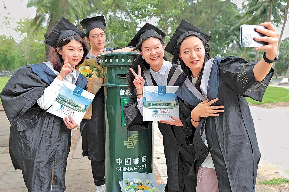 5月21日,海南大學外國語學院2024屆畢業(yè)生拿著《畢業(yè)紀念冊》在郵筒前打卡拍照,留下一份獨特的美好記憶。