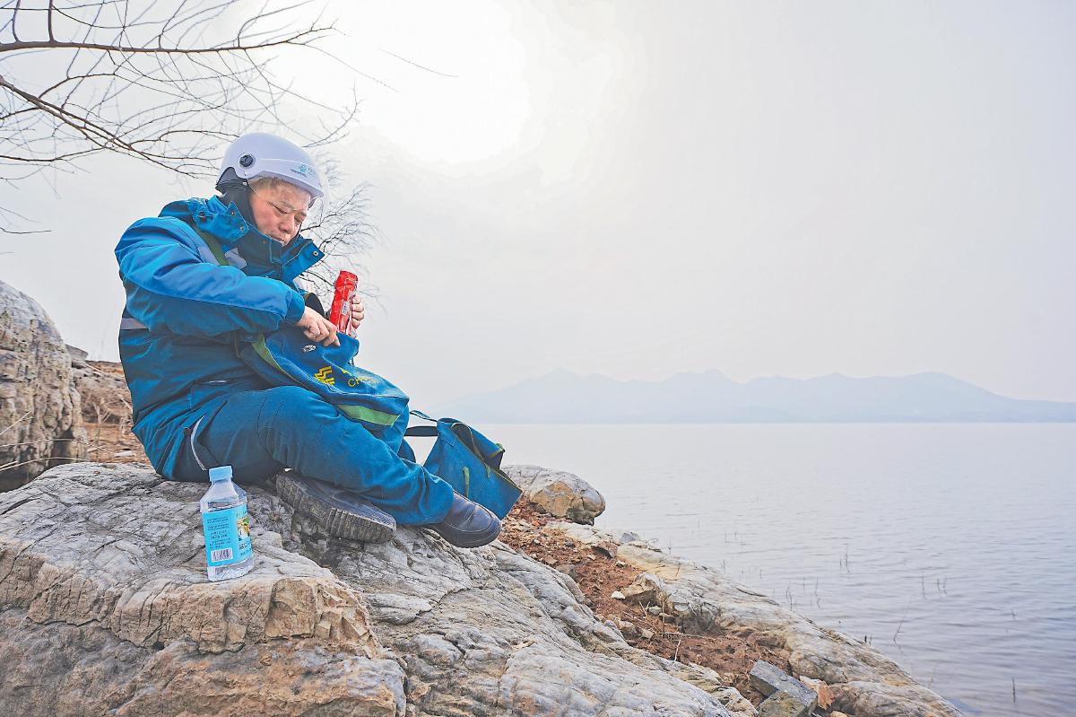 在等待渡船時,石新國吃點干糧、喝點水。 李平 攝