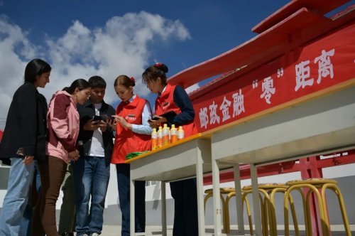 村委會(huì)中心迎風(fēng)招展的五星紅旗下,綠色的郵車即將完成郵件交接,而鮮紅的“郵政金融‘零’距離,鄉(xiāng)村振興‘郵’力量”橫幅旁,辦理業(yè)務(wù)的村民仍絡(luò)繹不絕。