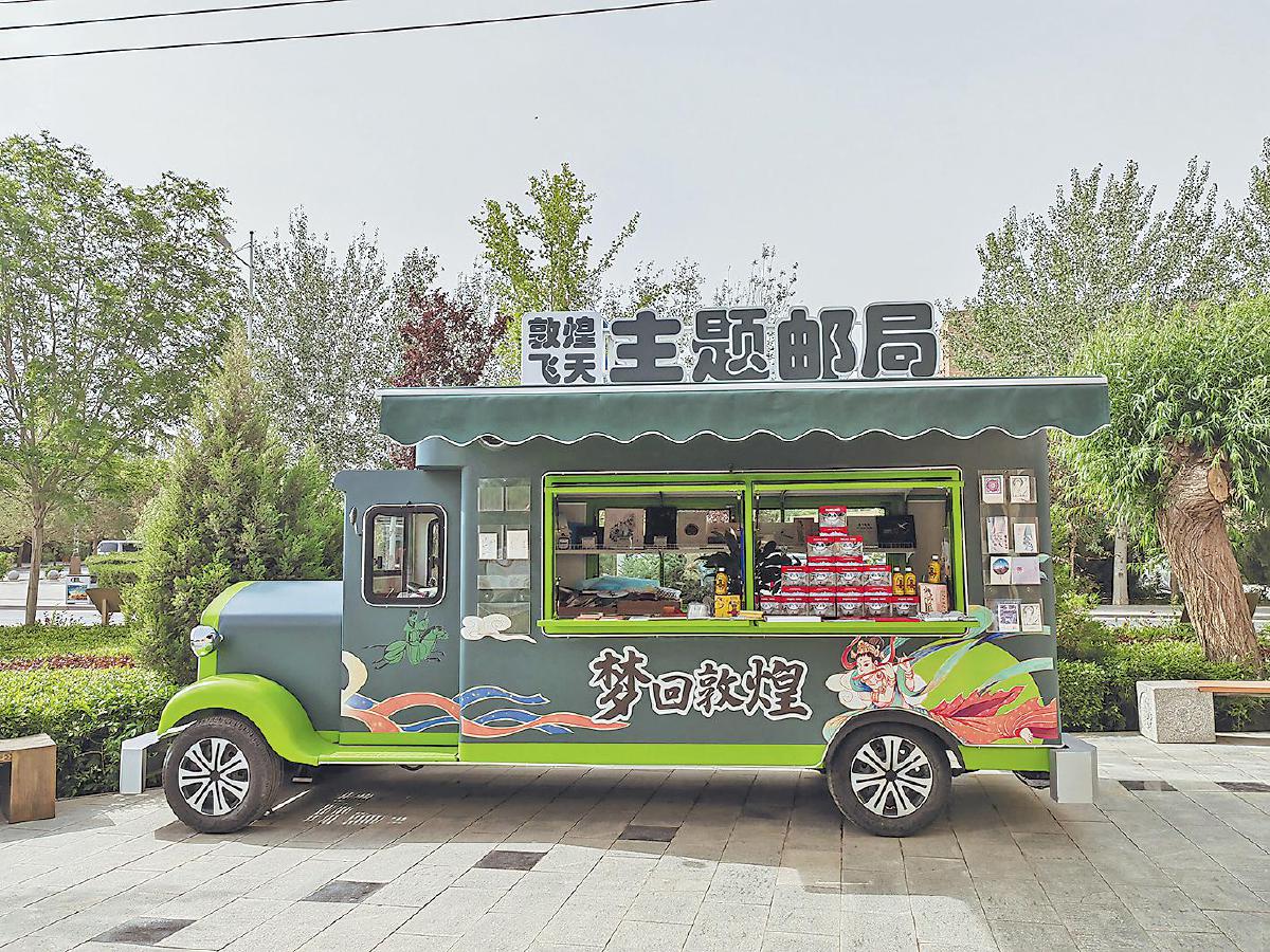采用街景文化創意的敦煌飛天主題郵局是敦煌市博物館門口一道亮麗的風景線。