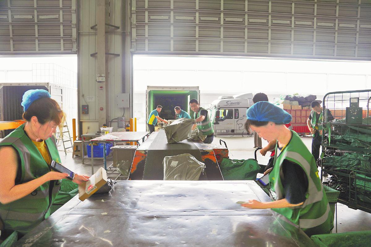陜西郵政工作人員在倉儲中心處理發往新疆的郵件。 □姚海龍 攝
