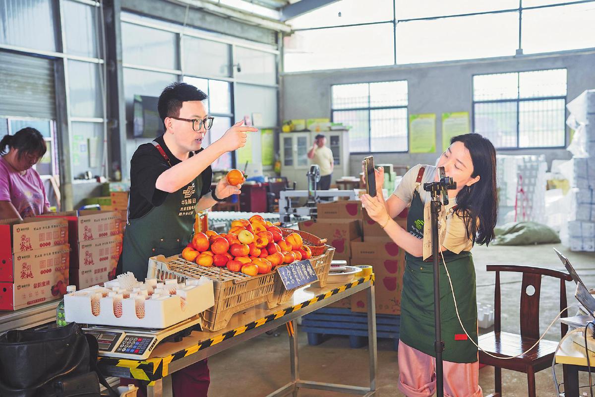 臨沂郵政在農產品基地直播帶貨蒙陰蜜桃。□禚洪濤 攝