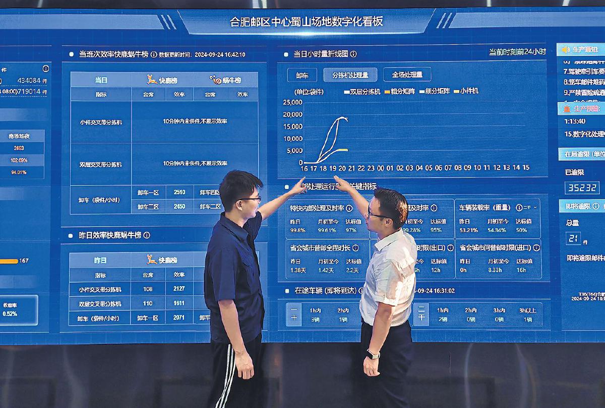 在車間內(nèi)的數(shù)字化看板上,“即將逾限郵件郵路TOP5”下不斷滾動(dòng)和更新數(shù)字,實(shí)時(shí)展示未來(lái)1小時(shí)即將逾限郵件數(shù)據(jù),并用顏色區(qū)分緊急等級(jí)。現(xiàn)場(chǎng)監(jiān)管人員則根據(jù)郵件掃描點(diǎn)信息判斷郵件所處環(huán)節(jié),及時(shí)干預(yù),避免成為已逾限郵件。這是采訪組在蜀山場(chǎng)地所見(jiàn)記憶深刻的一幕。