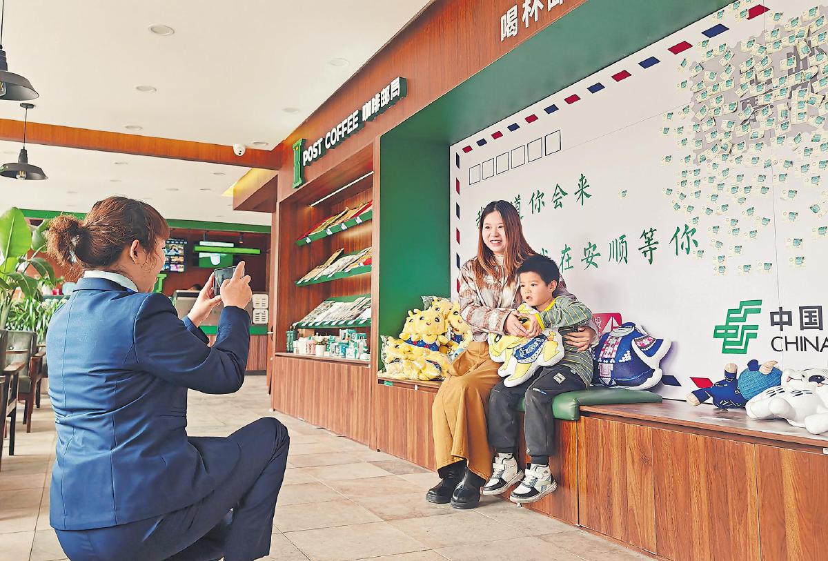 伴隨貴州省安順市打造城市旅游品牌的步伐,安順市郵政分公司深入推進(jìn)文旅融合,與安順旅游集團(tuán)文創(chuàng)商品發(fā)展有限公司攜手打造“郵局咖啡·遇見安旅店”。店內(nèi)裝修兼具郵政特色、古城風(fēng)格與現(xiàn)代風(fēng)情,設(shè)有文創(chuàng)展示、郵局文化、網(wǎng)紅打卡、印章加蓋及DIY明信片等區(qū)域,為游客提供獨特文化體驗,成為安順古城旅游的新地標(biāo)。圖為11月8日,郵政工作人員在為游客打卡拍照。