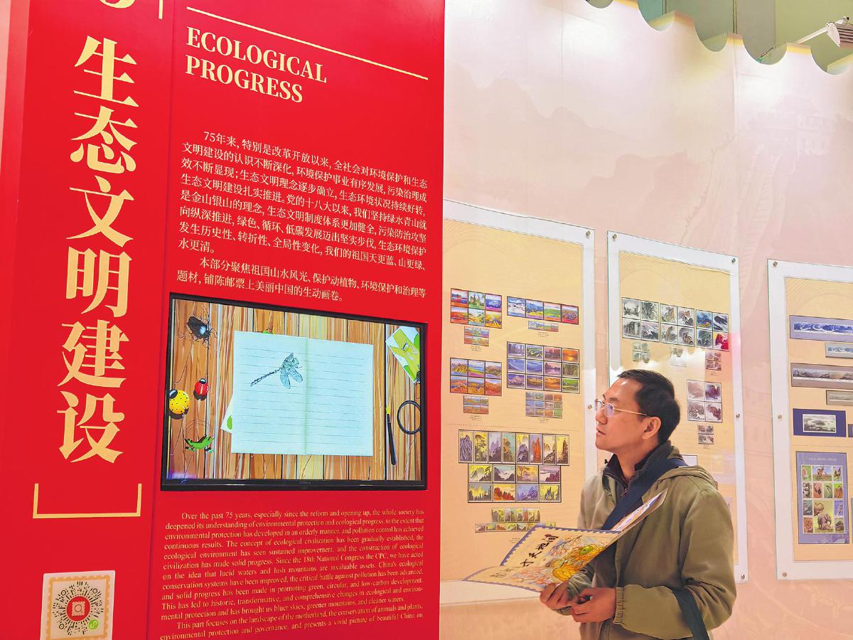 在慶祝中華人民共和國成立75周年郵票展上,新穎的電子展示方便觀眾觀展。