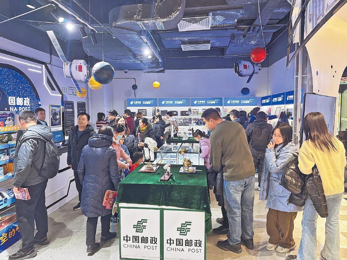 “太空郵局”快閃店以“太空艙視角沉浸式體驗太空魅力”為布局設計理念,讓步入快閃區的市民仿佛置身于空間站之中,感受太空探索的無限可能。開業首日,快閃店受到了眾多市民的關注,從經典航天器到星際探索場景,方寸之間盡顯宇宙魅力。集郵愛好者爭相搶購,生怕錯過心儀珍品。加蓋限量版太空郵戳的市民更是排起長龍。人們手持明信片,期待蓋上獨特印記,讓祝福搭載“星際快遞”送往遠方。