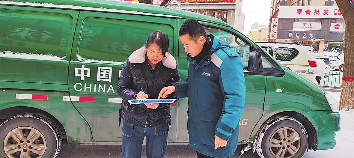 近日,陜西省榆林市定邊縣普降大雪,道路積雪結冰,給人們生活帶來諸多不便。而在各小區門口、社區門前都能看到郵政人忙碌的身影,他們一邊耐心地與客戶溝通,一邊迅速地卸下郵件,盡管被凍得手腳麻木,卻依然仔細核對每件郵件信息,確保郵件妥投,贏得了客戶的贊揚?!鯀乔扇亍z影報道