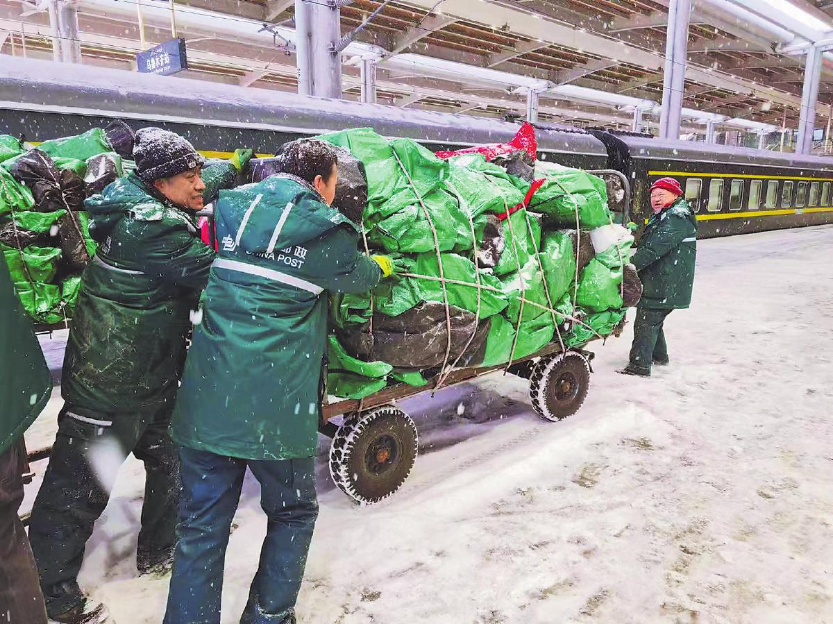 近日,新疆維吾爾自治區烏魯木齊市突降大雪,Z69次列車因此受阻,晚點半小時抵達烏魯木齊站。列車所掛郵政車廂裝載的400余件郵件急需轉運。轉運班組在僅有15分鐘的情況下,不畏嚴寒,緊密配合,按時完成了400余件郵件的卸車工作。□翟培 攝影報道