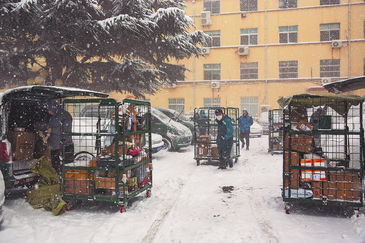 近期,寧夏回族自治區固原市普降大雪,郵政人頂風冒雪卸車、搬運郵件,保障所有郵件及時送達客戶手中。□陳黨?!z影報道