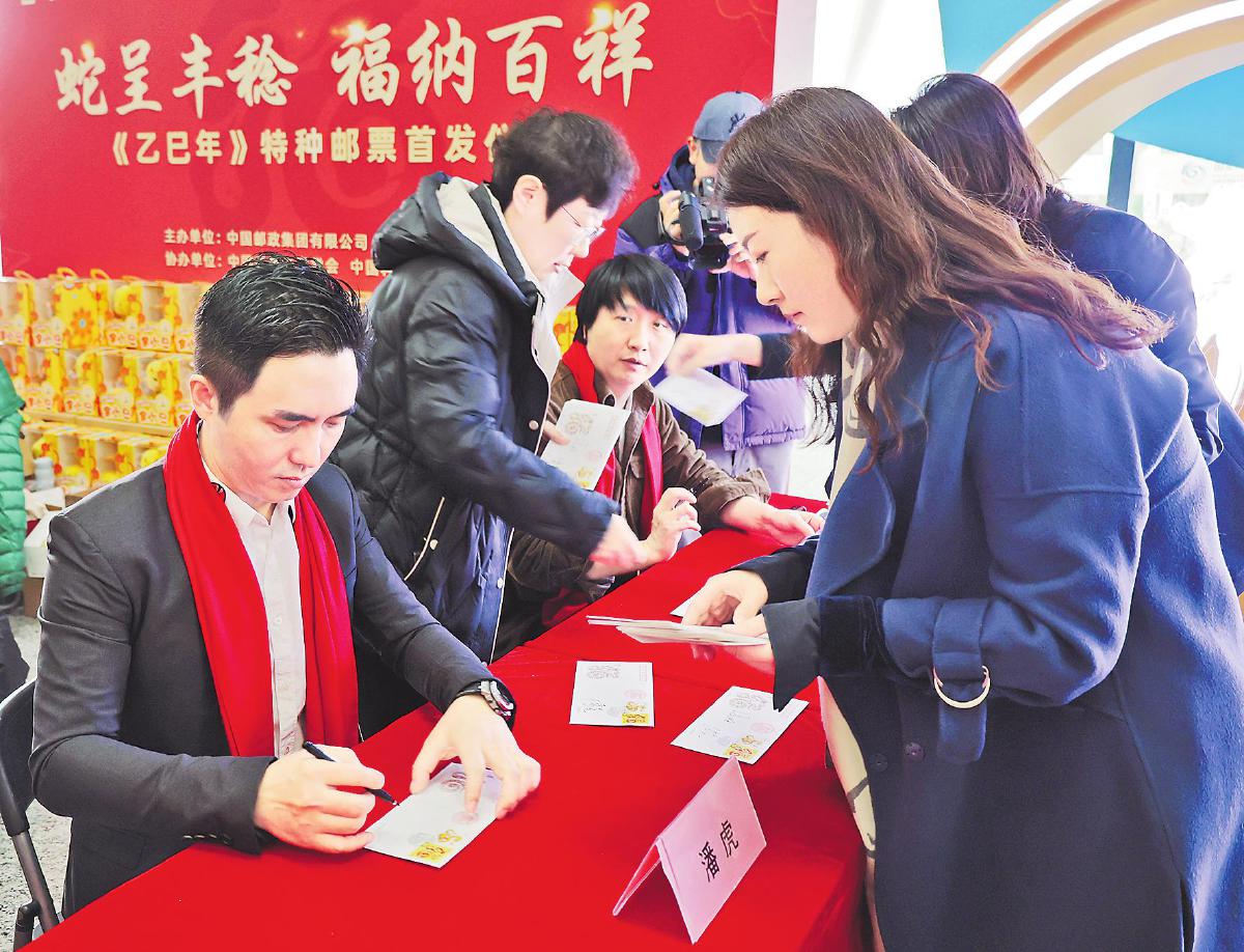 《乙巳年》特種郵票設(shè)計(jì)者潘虎、張旺在首發(fā)式現(xiàn)場簽售?!趵钗 z