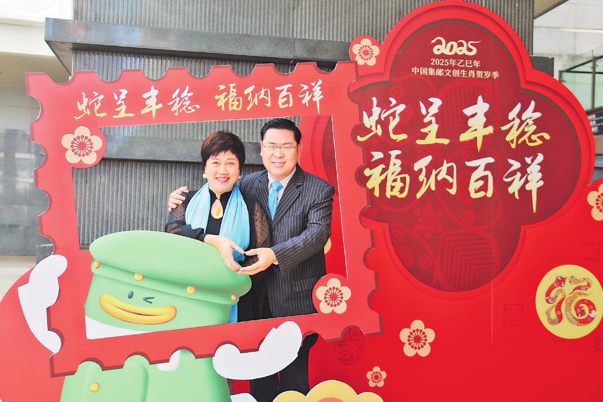 海南省郵政分公司聯(lián)合海南省博物館舉辦《乙巳年》特種郵票首發(fā)式。圖為郵迷在活動(dòng)現(xiàn)場打卡留念?! 觞S文燕 李慧 攝
