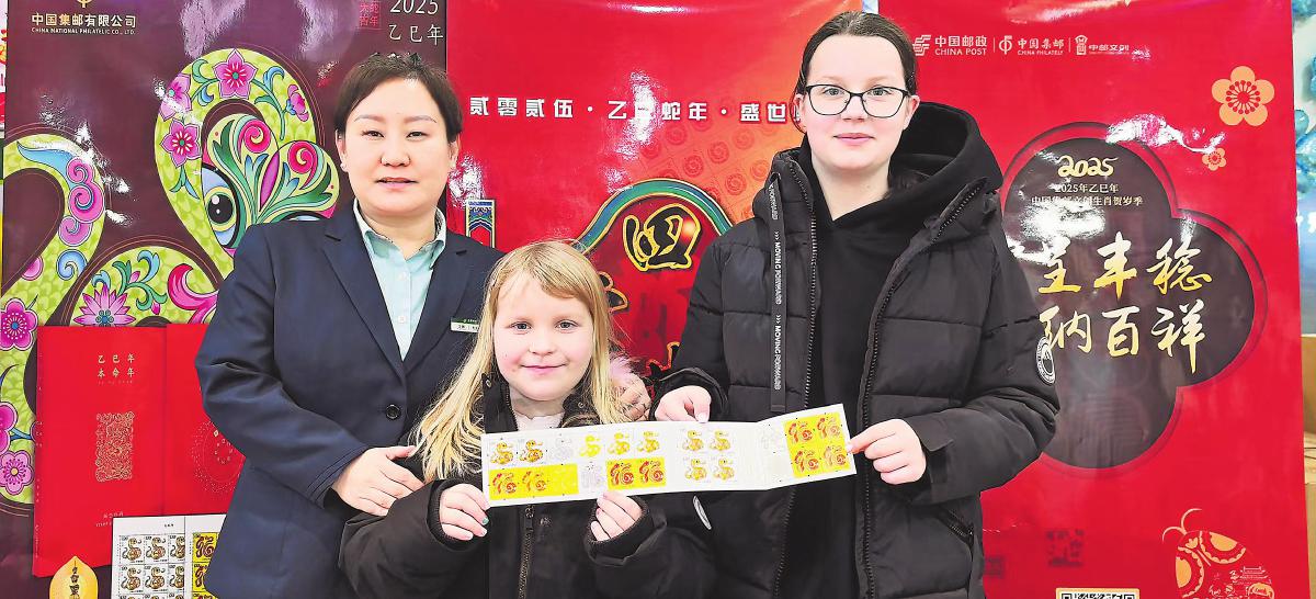 在黑龍江省雞西市郵政分公司郵電大廈營業(yè)所的生肖蛇票首發(fā)現(xiàn)場,來自俄羅斯的一家四口購買蛇年郵票和明信片并郵寄給遠(yuǎn)在故鄉(xiāng)的家人。營業(yè)人員與可愛的俄羅斯小朋友合影留念?!醣R明琴 攝