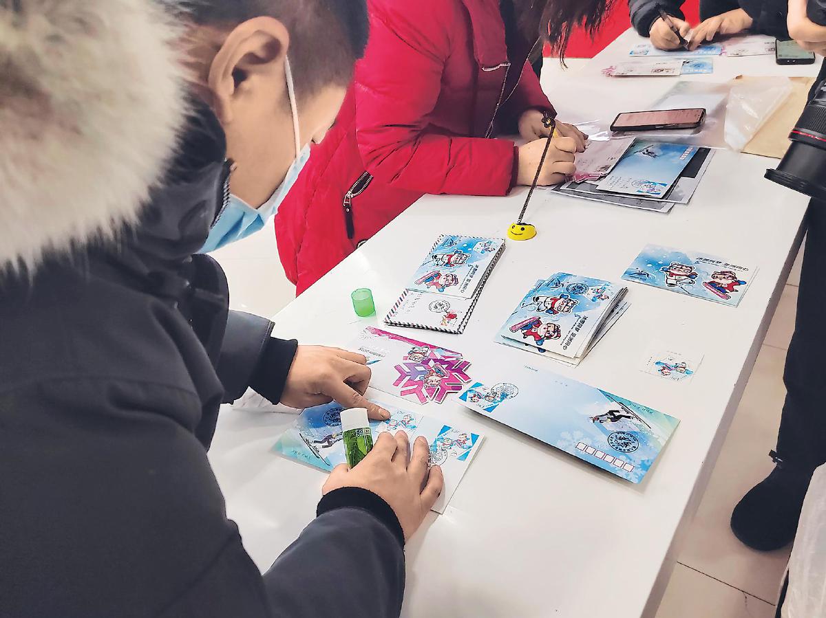 集郵愛好者在亞冬會紀念郵票首發現場自制首日封。 □張丹丹 攝