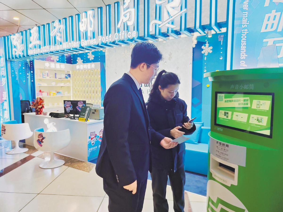 亞冬會志愿者在北大荒運動員村主題郵局打卡留念。□吳曉天 攝