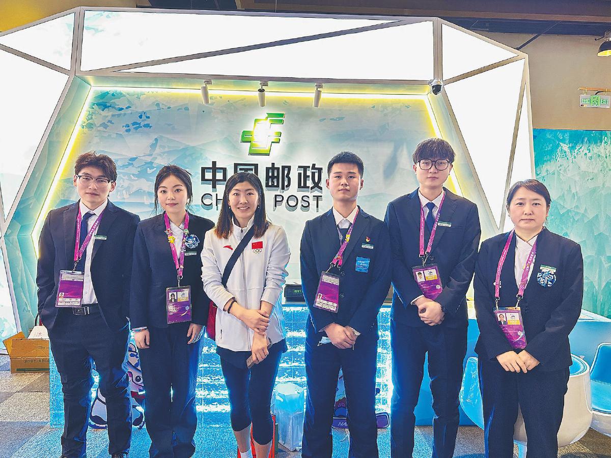 中國雪上項目首位全滿貫獲得者、本屆亞冬會自由式滑雪女子空中技巧項目冠軍徐夢桃(左三)在雅旺斯主題郵局郵寄包裹后,與郵政員工合影留念。□倪世雄 攝
