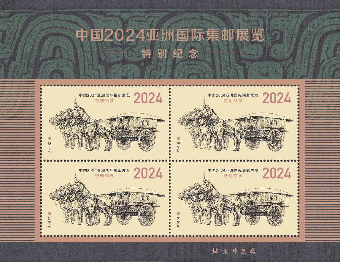 主圖選定后,北京郵票廠設計師夏競秋負責紀念張的整體設計工作。整版紀念張采用四方聯(lián)的雙聯(lián)張形式,首次以帶測控條的完整原始印張呈現(xiàn)。作為《中國2024亞洲國際集郵展覽》紀念郵票第1枚“鼎啟新章”的設計者,夏競秋選用上海博物館鎮(zhèn)館之寶——大克鼎器身花紋作為邊飾,色彩厚重古樸,與主體銅車馬雕刻圖案相互襯托,互為呼應,彰顯出濃重的歷史文化特色。