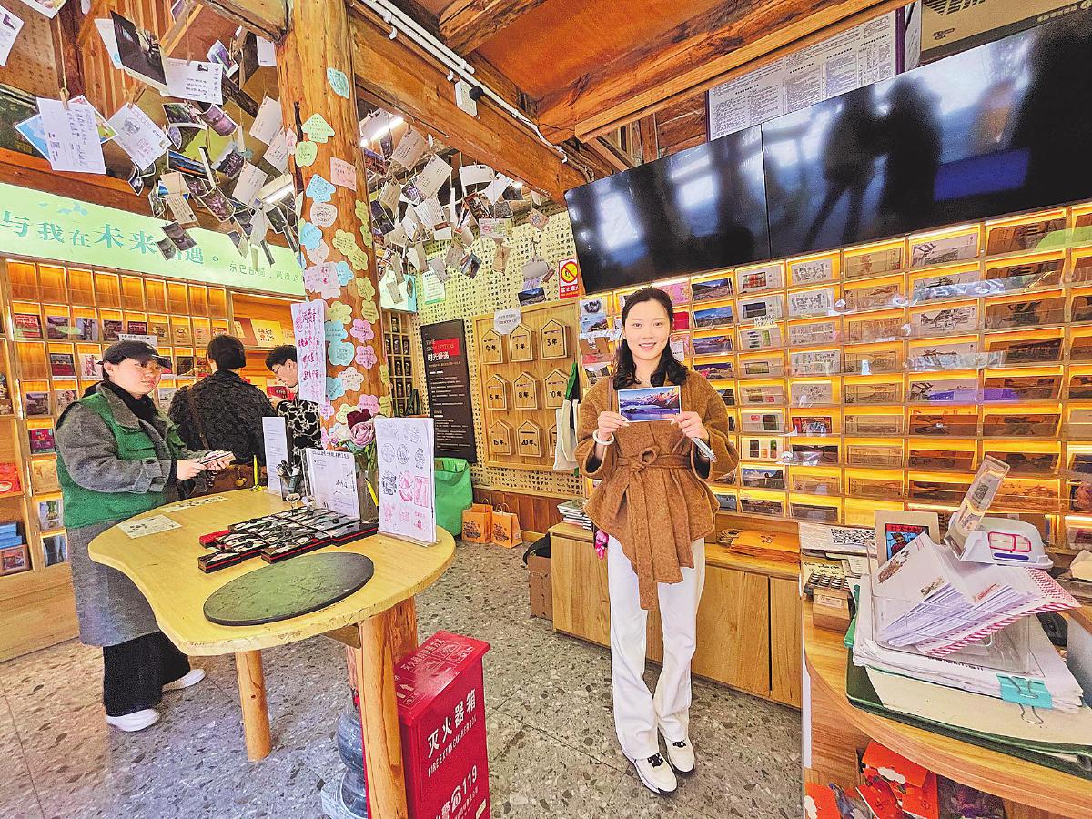 踏入東巴郵局,仿佛穿越了時(shí)空隧道,每一件物品都承載著古老的東巴文化,宛如歲月長(zhǎng)河中遺落的璀璨明珠。精美的東巴文字和麗江知名景點(diǎn)交織在一起,如同神秘的圖騰,呈現(xiàn)在明信片、郵票上,那是時(shí)光與智慧的交融。《麗江新風(fēng) 盛世祥瑞》文化禮品珍藏冊(cè)、《大研古鎮(zhèn)》郵折、《玉龍雪山》郵折……這些郵品將麗江的美景與東巴文化完美融合,仿佛一幅幅春日里的畫卷,讓人愛不釋手。別具一格的書簽、東巴文化剪紙、畫框、郵政瓦貓擺件系列文創(chuàng)產(chǎn)品不僅實(shí)用,更似一件件精美的藝術(shù)品,為春日里的閱讀時(shí)光增添了一份別樣的雅致。東巴郵局結(jié)合游客需求,專門設(shè)置游客休息書寫區(qū)域,讓游客把對(duì)麗江的喜愛與眷戀寫進(jìn)明信片,寄往遠(yuǎn)方。在麗江市文化和旅游局的支持下,東巴郵局還專門制作了打卡折,提升游客的互動(dòng)體驗(yàn)。