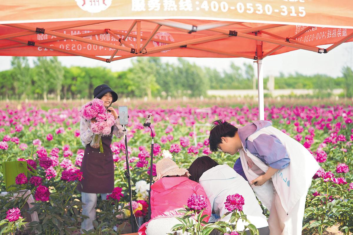 菏澤郵政直播團隊走進種植基地,開展芍藥鮮切花直播。 □趙現(xiàn)萌 攝