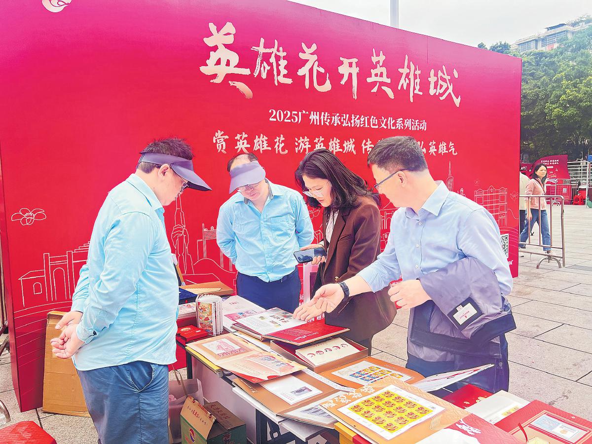 活動現場的郵政特色服務專區也成了一道亮麗的風景線。郵政工作人員以專業素養和熱情服務,向市民生動講解郵票背后的紅色故事,讓市民深入了解廣州的紅色歷史和文化內涵。同時,他們提供主題郵品封裝服務,精心包裝這份有意義的郵品?,F場展示的定制三色紀念戳,融合了木棉花、五羊雕塑等廣州城市符號,受到市民追捧。市民蓋戳后感慨道:“小小郵票,承載著深厚的歷史與文化,讓我們真切感受到廣州城的驕傲與溫暖!”