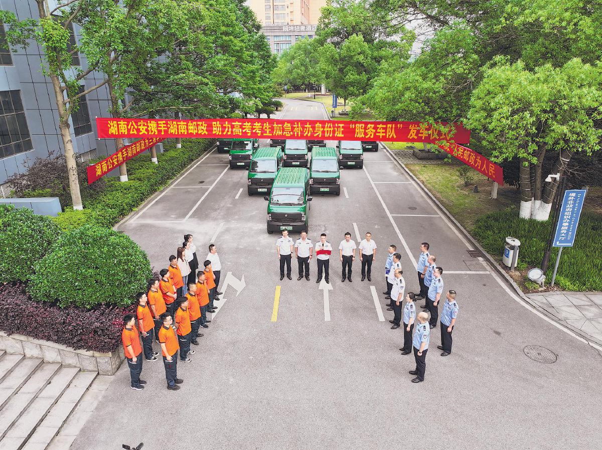 6月5日上午,湖南省公安廳、湖南省郵政分公司在省公民信息管理局攜手舉行高考考生身份證加急補辦“服務車隊”發車儀式。這是湖南警郵連續第七年為中高考考生開通身份證補辦加急“綠色通道”。