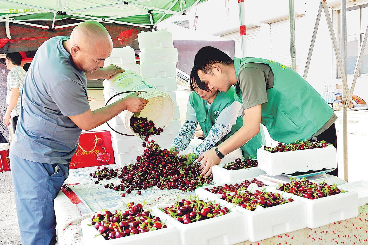 郵政員工幫助農(nóng)戶(hù)挑選櫻桃。